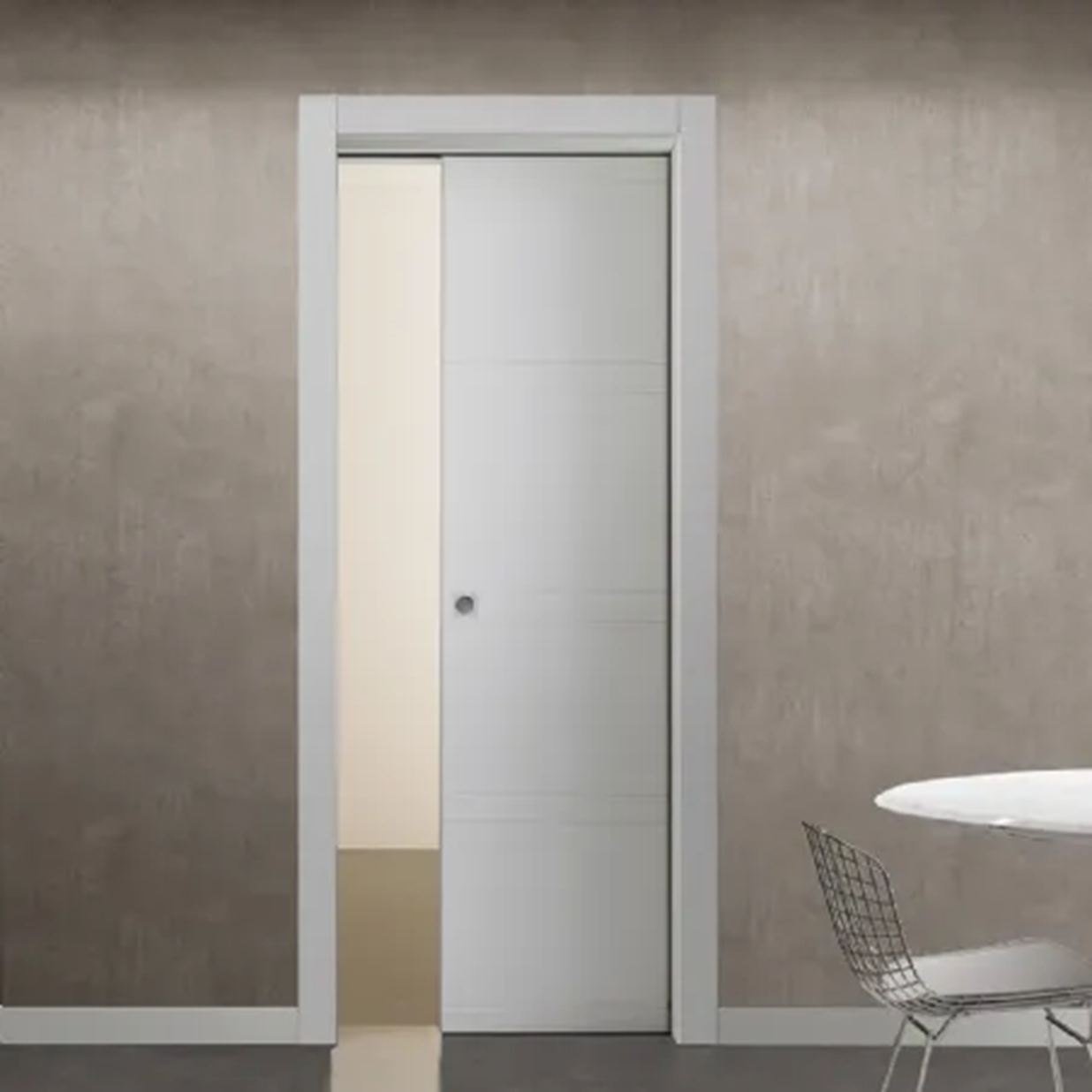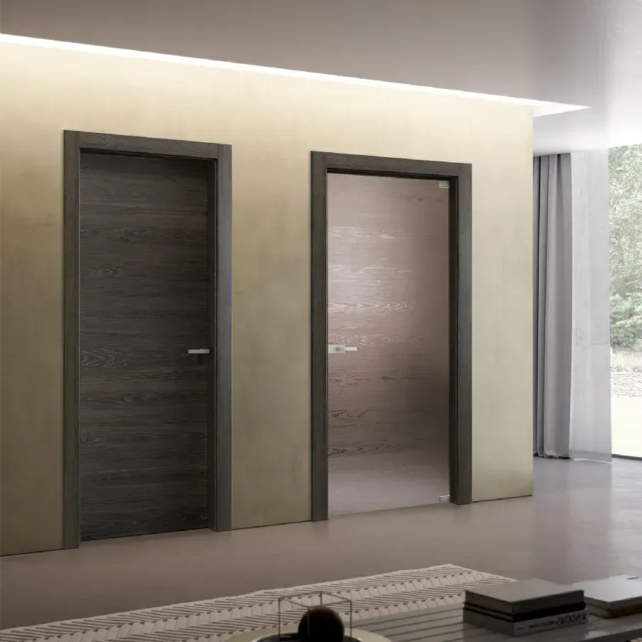 Una nuova soluzione moderna di telaio e coprifilo a sormonto, complanare sul lato a spingere che sottolinea il concetto minimale della porta moderna rendendo il telaio invisibile nella sua completezza. Telai e coprifili sono sono realizzati in MDF, certificati IDRO, CARB, FSC® e garantiscono una superficie di elevata complanarità.